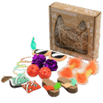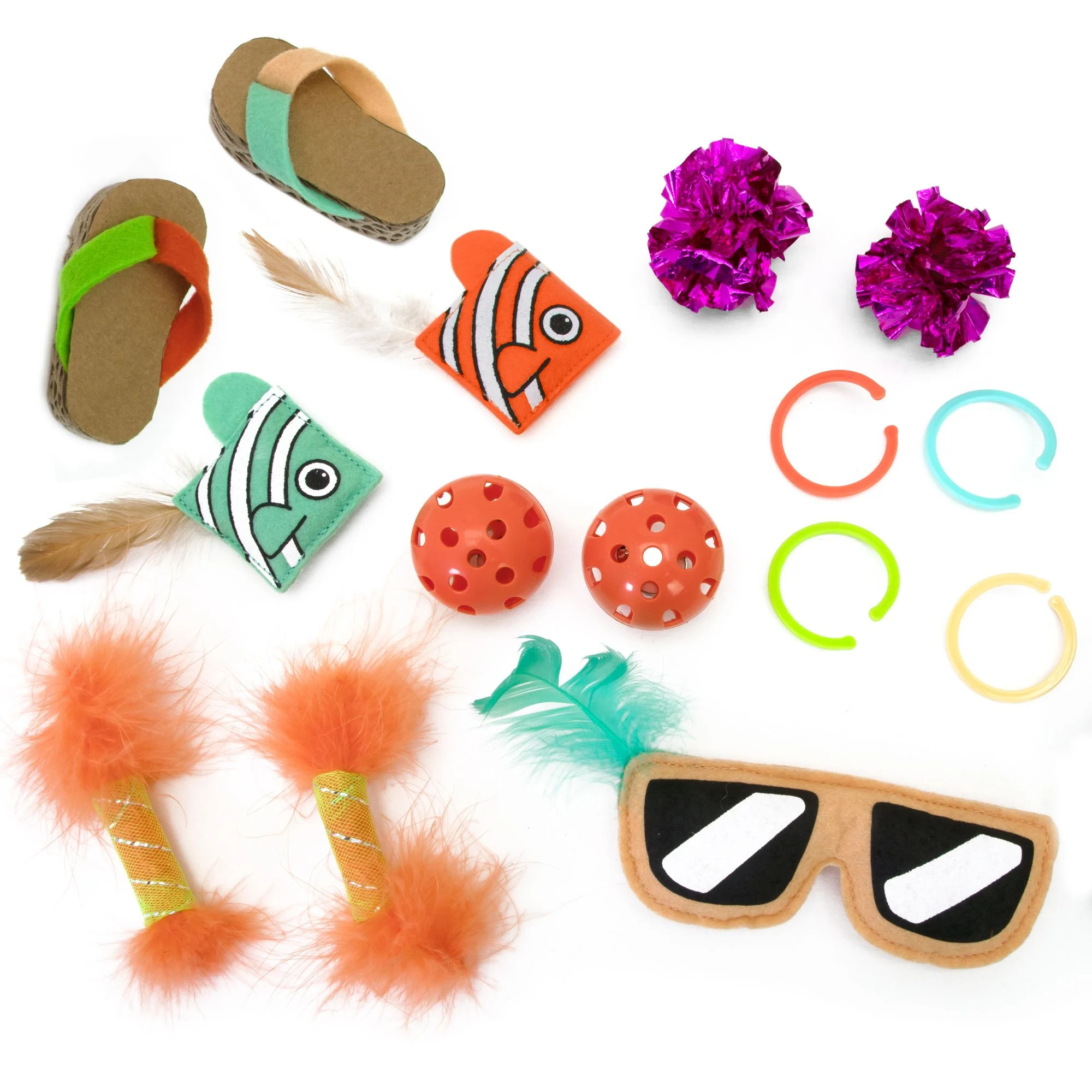 - 14 PIECES IN ALL: All together, each box contains: 1 Sunglasses Toy, 2 Jingle Balls, 2 Mylar Balls, 2 Fancy Fish, 2 Flip Flops, 2 Feather Traps, and 3 Fling Rings. Pace out the fun for weeks, or have one giant “What do I play with first??” surprise bash